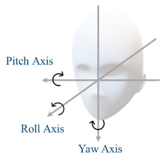 As for the inclination of the head, there are three axis directions: the yaw axis, the pitch axis, and the roll axis (Figure 5). The yaw angle and the pitch angle are necessary for gaze estimation. The yaw angle and the pitch angle of the head are calculated using differences in the recorded marker coordinates.