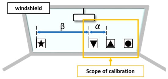 In previous methods, there was a problem with the narrow range of the estimated head angle. Therefore, we expanded the estimable range by including a new marker, and we evaluated the accuracy of the improved method. In order to expand the estimation range, a new star marker (Marker4 in Figure 7) was added to the left end. In order to calculate head movement and angle information, it is necessary to record a reference position for each marker. As described previously, subjects performed calibration by facing forward for five seconds before beginning to drive. The range of calibration is shown in Figure 8. Calibration is performed with the forward-facing position. Marker4 is excluded from calibration because Marker4 does not appear on the screen when facing the front. Therefore, the reference position of the star marker was calculated using the ratio of α and β as shown in Figure 8. The coordinates of Cx were obtained by transforming Equation (6), as in Equation (7), to Equation (9). Using the obtained Cx, the accuracy of the head orientation calculation was estimated (Figure 9).