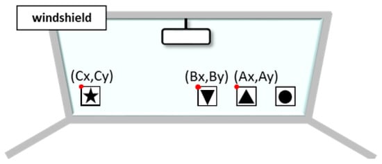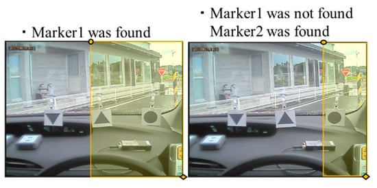 This system required calibration prior to data collection onset. We defined the forward-facing position of the head as angle 0 (deg). We placed the markers (Marker1, Marker2, and Marker3) on the dashboard of the car, with one of the three markers directly in front of the driver (0 (deg)). We asked the driver to face forward for five seconds in order to record the reference position for each of the three markers. These reference positions were used for template matching. The driver’s head angle was calculated after determining the head movement amount “A” using the difference between the current marker’s position and the reference position. Due to movement on the roll axis (Figure 5), it was possible for two markers to be found during image processing; this problem is addressed in the next section.