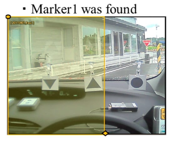 We proposed a head angle estimation method using template matching. We used the viewing camera of TalkEyeLite to obtain the head movement information. Although the head angle estimation method using the RGB-D sensor needs to set a sensor, the head angle estimation method using the proposed template matching uses a field of view camera attached to TalkEyeLite. Therefore, our proposed method has the merit that it can be easily used in various environments. Since the estimation of the line of sight and the head angle is performed during actual car driving, it is necessary to use a method that can estimate the line of sight given the restricted physical space available for equipment and measurement; template matching accomplishes this. We installed three templates as shown in Figure 3 (Marker1, an upward triangle; Marker2, a circle; and Marker3, a downward triangle) on the front glass of the car. We performed template matching using these three template images to estimate the head angle as described by Figure 4.