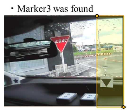 We extended the search range to increase the recognition rate from template matching. In the proposed method from Section 3.2, if the marker was found in a previous frame, template matching was performed around the position of the marker in the previous frame. However, the template matching would fail if the driver moved their head a large distance before turning the car left or right because the marker would move out of the search range. Additionally, the division of the search range into sections lengthened the processing time due to failed template matching. To address these issues, we enabled the system to alter the search range based on the quantity of movement between the current and previous frames. For example, if the marker moved significantly right from two frames before to one frame before, the search range was extended to the right side by a constant range. Figure 15 illustrates an example. We judge that the marker moved significantly from the head movement angle and the eye movement angle. We also judged from the visual field camera image.