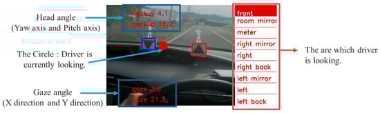 The output screen of this system is shown in Figure 17. Our system showed the head angle, the gaze angle, the driver’s gaze (red circle), and a classification of the area that the driver was looking at. There were nine area classifications: “front,” “rearview mirror,” “meter,” “right mirror,” “right,” “right back,” “left mirror,” “left,” and “left back.”