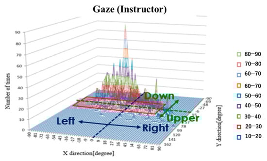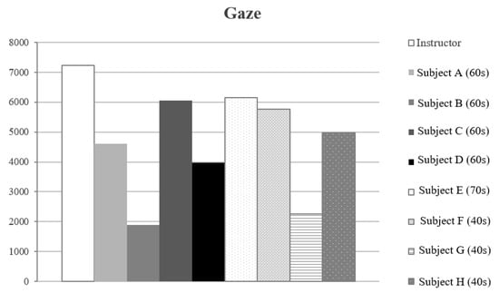 When the threshold value is 5%, the maximum value in the X direction is Xmax and the minimum value is Xmin. We defined X as Xmax–Xmin. Similarly, Y is Ymax–Ymin in the Y direction. The gaze range was calculated by X × Y, and the gaze ranges of the instructor and the general subjects (subject A to subject H) were compared (Figure 21). We found that subject B (60–69 years old) and subject G (40–49 years old) had narrow gaze ranges.