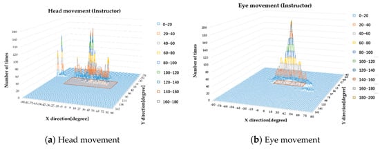 In order to compare the gaze ranges of the elderly participants and the instructor, the head estimation angle, eye movement angle, and gaze angle were compared using histograms. Figure 18 is an example histogram of a participant’s gaze. The vertical axis represents the number of occurrences, the horizontal axis represents the X direction (left and right for the participant; the positive direction on the axis is right, the negative direction on the axis is left), and the depth represents the Y direction (up and down for the participant; the positive direction on the axis is up, the negative direction on the axis is down). A gaze range calculated with Gaussian fitting (95% confidence interval) is given by the shaded area. In other words, a wide shaded area indicated that the participant’s gaze range during driving is wide.