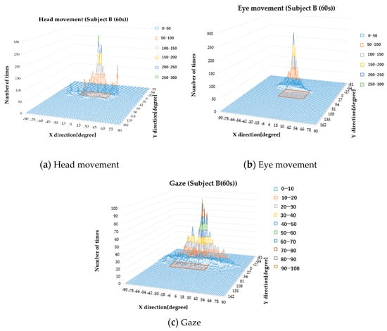 Figure 19 and Figure 20 are histograms of the head angle, the eye movement, and the gaze during car driving, which means the head angle, eye movement angle, and gaze angle are distributed in the area during running. Figure 18 shows the histograms from the driving school instructor, and Figure 19 shows the histograms from subject B (60–69 years old). The amount of data varied by subject.