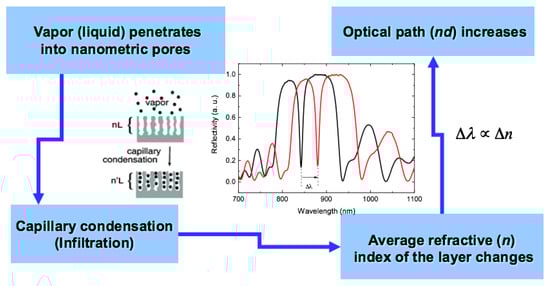 Every substance that penetrates into the sponge-like matrix of a PSi layer changes its average refractive index so that the optical spectrum also changes. The shift of the optical spectrum depends on two parameters, one being the pore-filling ability, the other being the value of the refractive index. The first is strictly determined by the chemical nature of the substance, such as hydrophilicity or hydrophobicity, viscosity and so on; while the second is an intrinsic characteristic of the substance considered. This is the reason a PSi device is only a specific optical sensor, i.e., it gives different responses to different substances, but is not selective, which means that it would not be able to recognize a component in a complex mixture [,].