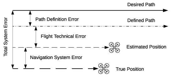 In our proposed model, illustrated in Figure 3, we further divide the Class G airspace into horizontal segments, referred to as layers, at different operational altitudes with separation allowing safe UAV flight. This extends a variation of the hemispheric rule [51] to Class G, where the separation between layers is guided by the Containment Limit (CL) of the largest UAV allowed in Class G. The CL of an aircraft is explained by ICAO as the volume with a 95% probability the aircraft is within, at any time of its stated position, both horizontally and vertically [53]. This can be derived from the Total System Error (TSE), illustrated in Figure 4. The TSE is the difference between the true position and the position on the desired/assigned flight paths of a UAV. It is the vector sum of the Navigation System Error, the Flight Technical Error and Path Definition error. The TSE defines the accuracy of a navigation system.