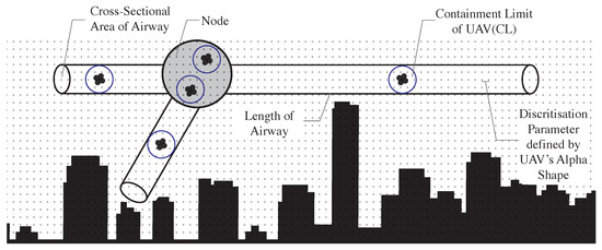 Following the approach explained in Reference [54], a city’s elevation map can be discretised using a topological analysis into a data-set of static-obstacle-free points within the different layers. This is key for structured airspace design and path planning. The level of detail of the discretised airspace is defined by the volume representing the UAV (alpha shape) as explained in Reference [55]. The resulting volume of obstacle-free space is referred to as the airspace which is the shared resource that is utilised by the UAVs. The latter comprises of Airways and Nodes, airways being corridors connecting nodes within a layer (horizontal) or between layers (vertical or diagonal). Airways allow UAVs to fly without direct communication with the UTM, guided only by the rules of the airway (velocity limits, flight headings and maximum traffic capacity) and information exchanged between UAVs through ad-hoc communication. Airways’ cross-sectional size is defined by the UAVs’ CL, while their lengths is defined by the segment’s static-obstacle-free space as well as airway-intersections, referred to as nodes (cf. Figure 5).