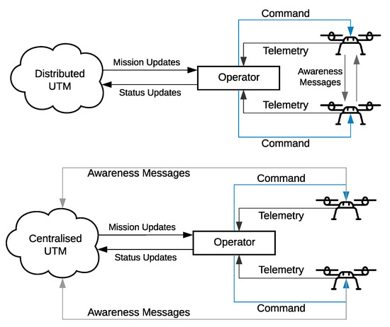 According to IEEE’s technical committee on networked robots [57], a wireless networked robot system (WNR) is a subset of wireless sensor and actuator networks (WSANs). Such a system can be identified by two elements: (a) autonomous capabilities and (b) network-based cooperation. The first refers to the necessity, for a robot, to autonomously move and interact with the physical environment; while the second refers to its capability of communicating with others using radio technology. Over the recent years, the interaction between IoT and flying ad-hoc networks (FANETs) has become an important topic of research [58,59]. The interested reader can find a detailed analysis of such communication protocols in References [60,61,62]. Due to the high mobility of UAVs in flight, at this stage of work, we consider UAVs to communicate together (UAV-to-UAV) and to the infrastructure (UAV-to-Infrastructure) in an ad-hoc manner, similar to the communication model proposed in References [62,63]. A simplified view of the different types of communicated messages is presented in Figure 6 based on Reference [15]. In the same article, the authors firstly categorise the types of communicated messages based on their repetition rate and size then compare the communication performance of a centralised and a distributed UTM in a conflict resolution scenario.