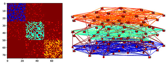 Experiments are conducted on a three layer network based on the Erdos – Rényi model using Python’s NetworkX library and the multiNetX package. Each layer contains the same number of nodes and each airway (intra and inter network) is assigned three weights, t, e and c, uniformly at random in predefined intervals. Figure 7 presents an example of a three layer network with 75 nodes (25 nodes per layer) and its adjacency matrix. The parameters used for the experiments are described in Table 1.
