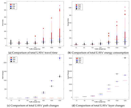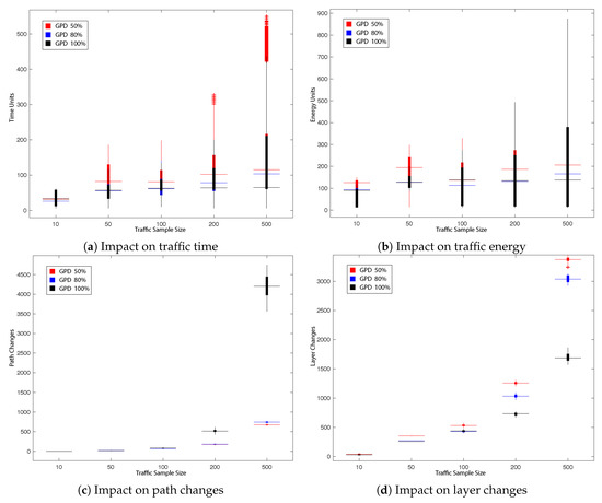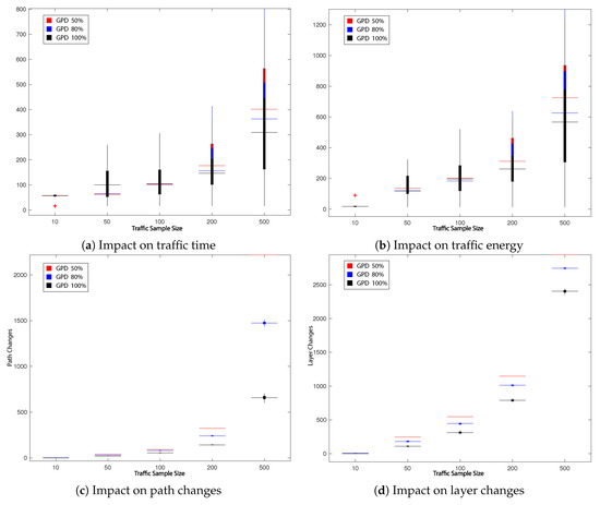 It can be deduced from Table 2 and Figure 8, of the first part of the experiment, that for the smaller traffic sample sizes of 10 and 50, GPD with 50% and 80% generally showed improvement over of 100% in total UAVs’ travel time and energy consumption. Nevertheless, of 100% showed better performance when it came to total traffic path and layer changes for the same samples. However, since the main global objective is a scalable system, it is important to study the performance of the heuristic at larger sample sizes. While that is the case, GPD with of 100% outperforms the same heuristic with 50% and 80% for the larger traffic samples. Improvements can be observed with statistically significant difference across all the traffic performance indicators tested for traffic sample size 500 and 200, with exception of total UAVs’ queue counts in the network for the latter.