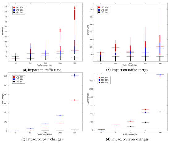 Analysing the results obtained, it can be deduced from Table 4 and Figure 10 that, with the exception for the smallest traffic sample size of 10, LPG with of 0% generally showed improvement with statistically significant difference over of 80% and 50% across all the traffic performance indicators tested for the remaining traffic sample sizes. These results indicate that pheromone deposit caused a fast dispersion of UAVs across the network, which had a negative impact only for the smallest traffic sample. On the contrary, it led to an overall improvement in reducing total UAVs’ travel time and energy consumption across for all other traffic samples.