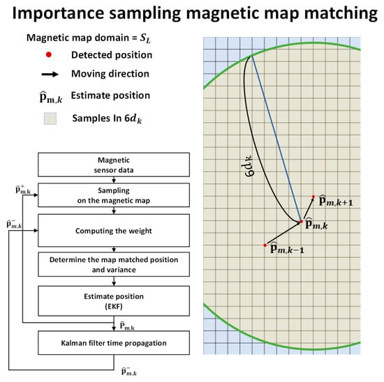 Figure 6 shows the conceptual diagram of importance sampling, candidate boundary, and algorithm flowchart. The magnetic map-matching algorithm using importance sampling is summarized as follows: