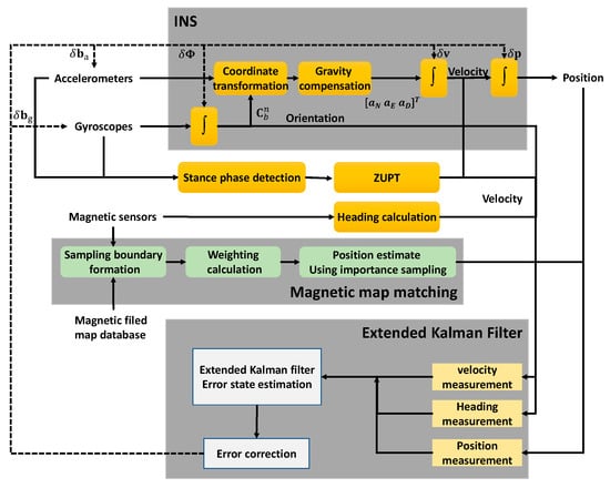 In this study, map-matching-aided pedestrian dead reckoning (MAPDR) was constructed. To estimate and compensate for the navigation errors, a 15th-order EKF is used. The error state vector is given by the following equation: