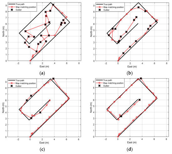 Comparison of map-matching results based on true path. (a) Foot-mounted single sensor case, (b) waist-mounted single sensor case, (c) multiple sensors without outlier mitigation, and (d) multiple sensors with outlier mitigation.