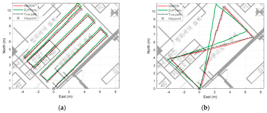 The proposed MAPDR algorithm was compared with PDR using ZUPT only, which is a conventional method, and MAPDR using a single sensor. To compare the accuracy, the average RMS errors at waypoint were compared. The critical points where the direction changes are chosen as waypoints. Each experimental result is shown in Figure 10 and RMS waypoint position errors (WPEs) are summarized in Table 5.