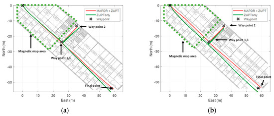 The experiment result of MAPDR with site 2 partial magnetic map (a) experiment 1 (b) experiment 2.