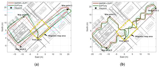 In the case of conventional indoor PDRs using only ZUPT, the position error is not corrected, and the position error diverges with time, which is mainly caused by heading errors and velocity errors. With MAPDR, the position is corrected every time when the stance phase starts so that an accurate position can be acquired. Moreover, the magnetic sensor attached to the waist corrects the heading, which contributes to the position accuracy. The results in Table 5 show that the proposed algorithm enhances the PDR performances effectively.