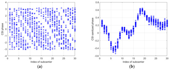 Comparison of (a) the Channel State Information (CSI) raw phases with (b) sanitized phases.