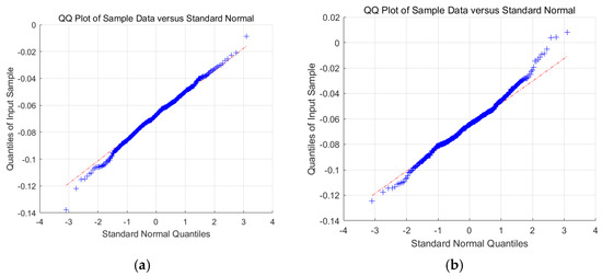 Quantile–quantile (QQ)-plot of a subcarrier (a) when the monitoring area is empty and (b) when the target stands at a location in the monitoring area.