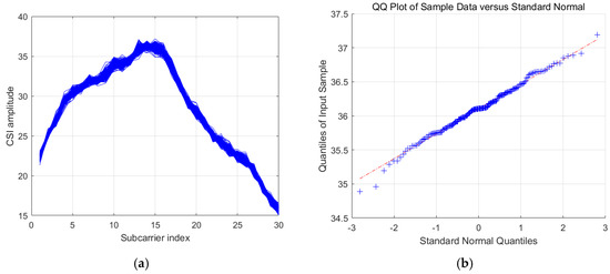 (a) The situation where CSI amplitudes form one cluster; (b) the QQ-plot of a subcarrier whose amplitudes exhibit an approximately Gaussian distribution.