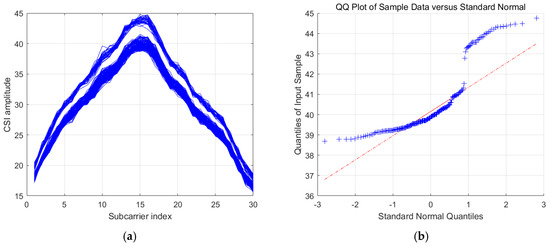 (a) The situation where CSI amplitudes form two clusters; (b) the QQ-plot of a subcarrier whose amplitudes exhibit a non-Gaussian distribution.