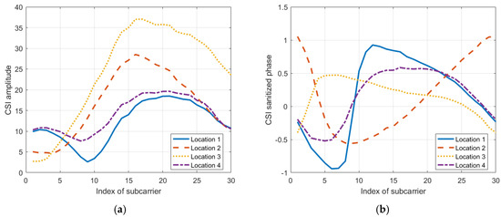 The mean vectors of a communication link tested at 4 locations for (a) the CSI amplitude and (b) the CSI sanitized phase.