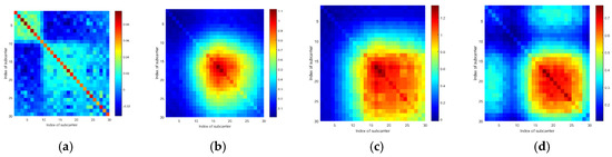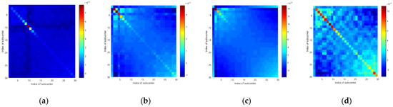 The CSI sanitized phase’s covariance matrices of a communication link tested at 4 different locations: (a) Location 1, (b) Location 2, (c) Location 3, and (d) Location 4.