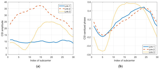 The mean vectors of (a) the CSI amplitude and (b) the CSI sanitized phase from 3 different communication links.