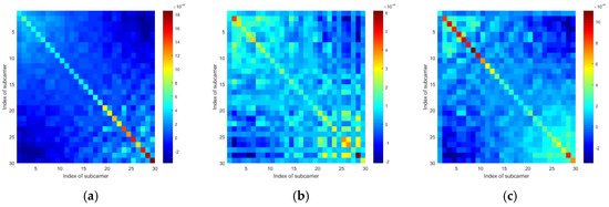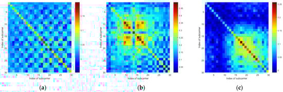 The CSI amplitude’s covariance matrices of 3 different communication links: (a) Link 1, (b) Link 2, and (c) Link 3.
