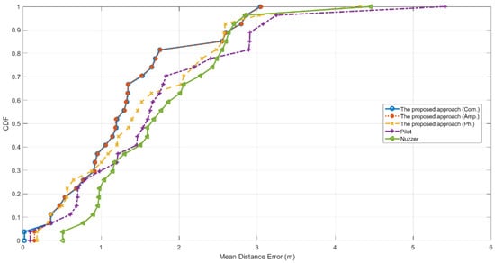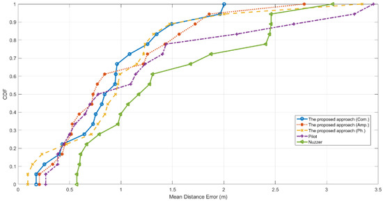 In the laboratory testbed, which is cluttered with office appliances, the multipath effect is very strong, making localization accuracy degraded. The proposed approach has a localization error of 1.34747 m when using the combined fingerprints, with and set to be 4 × 10−3 and 6 × 10−5. In comparison, when using merely the CSI amplitudes, the proposed approach has slightly worse performance, which is 1.35196 m with set to be 4 × 10−3. When only using the phase fingerprints, we set to be 5 × 10−3, finally achieving a localization error of 1.55726 m. The other two approaches, in this case, have poor performance, with Pilot to be 1.74823 m and Nuzzer 1.80899 m, both worse than the proposed approach.