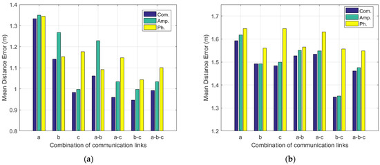 The results of the laboratory are shown in Figure 15b. We can see that the best performance is achieved when employing , for whatever type of fingerprints. By adopting a–b–c, we can obtain the suboptimal results, for an arbitrary type of fingerprints. However, using do not yield lower localization errors than using , but it still produces better results than the single link . We can see a similar result when using , where it achieves lower localization errors than the single link but higher localization errors than the link , on the condition of adopting the amplitude fingerprints or the combined fingerprints. Meanwhile, with the phase fingerprints, beats the single link and c.