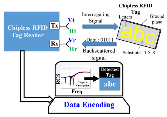 Chipless tags for a radio frequency identification (RFID) technology has drawn considerable recent attention, owing to its associated advantages of low cost as well as small size, in comparison to the traditional chipped RFID tags printed on silicon chips [1,2,3,4]. It is anticipated that chipless-RFID tags would also replace the barcodes in the near future, since they offer the additional advantages of no-line-of-sight requirement, enhanced encoding characteristics and reduced manufacturing cost, as compared to the barcode-based designs [5]. Low-cost printing advantage, offered by the chipless RFIDs, makes them a powerful candidate for numerous smart applications in the Internet of Things (IoT) [2,5], medical diagnosis [6], classified document security [1,7], low-cost shipment tracking and warehouse inventory control [4,7,8,9].