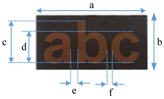This section details the design of the English alphabet-tag used for the actual analysis by using full-wave numerical modeling and demonstrates the use of the proposed method in Figure 1. The alphabet letters can be designed for any font size and inter-letter spacing. In this study, the use of the topology for the realization of the alphabet letters (e.g., a, b and c) is based on the ‘Arial font’ with a font size of 15 mm and no click spacing between the neighboring letters. However, it should be pointed out that the analysis could be conducted for any type of letter, font, and size by using the proposed methodology.