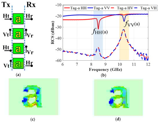 Figure 3 shows that the designed tag corresponds to a resonant metallic letter, which is printed on a thin grounded dielectric slab. The interaction of the launched incident plane wave with the metallic tag introduces a surface current around the tag geometry. The intensity of the induced surface current on the tag depends on the specific resonance frequency corresponding to the structural properties of that tag. For the sake of illustration, the different simulated co- and cross-polar backscattered RCS signals for a single metallic letter-tag ‘a’ are shown in Figure 4b, which illustrates that the prominent resonances (dips) in the amplitude of co-polar (HH/VV) components of the backscattered RCS signal, and the corresponding peaks in its cross-polar (VH/HV) components, respectively. These are the signature resonance properties of this particular resonant ‘letter-a’ and are referred to as ‘fHH (a)’ and ‘fVV (a)’ for the co-polarization cases. The induced surface current around the letter-tag will be maximum at these resonance frequencies, as shown in Figure 4c,d at ‘fHH (a)’ and ‘fVV (a)’, respectively.
