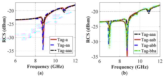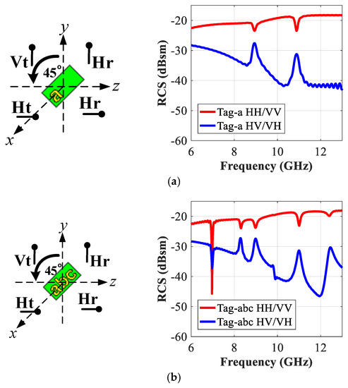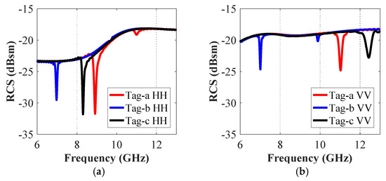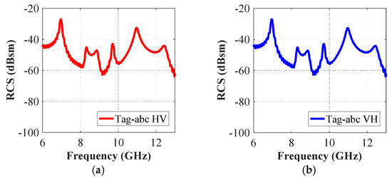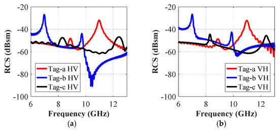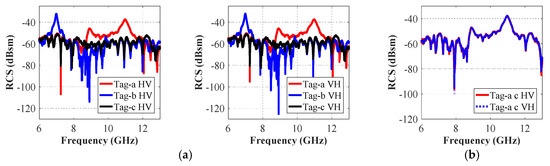 Cross-polar RCS simulation results of tag-a, -b, and -c: (a) Cross-polar HV RCS responses; (b) Cross-polar VH RCS responses.