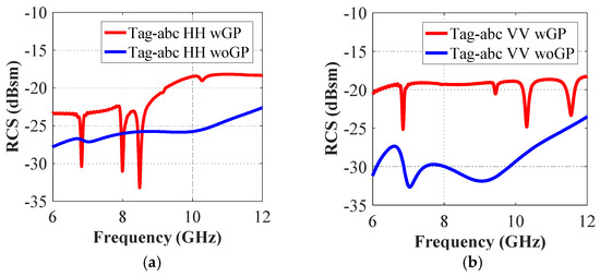 Co-polar RCS simulation results of tag-abc with and without the ground plane under the tag structure (a): Co-polar HH RCS responses; (b) Co-polar VV RCS responses.