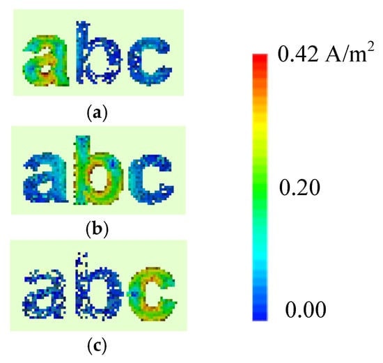 Surface currents obtained for the tag-abc excited with horizontal plane wave: (a) at unique frequency signature corresponding to letter ‘a’ i.e., fHH = 8.90 GHz; (b) at frequency signature corresponding to letter ‘b’ i.e., fHH = 6.96 GHz, and (c) at frequency signature corresponding to letter ‘c’ i.e., fHH = 8.32 GHz.