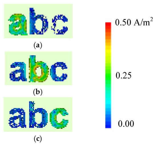 Figure 11 shows the surface current distribution at the signature resonant frequencies of each corresponding tag (see Table 1) i.e., fHH = 8.90 GHz for latter ‘a’, fHH = 6.96 GHz for letter ‘b’, and fHH = 8.32 GHz for letter ‘c’, for the case of horizontal plane wave excitation. Similarly, the current distributions at the corresponding co-polar frequencies for vertical plane wave excitation are shown in Figure 12. Indeed, by observing the current distribution results at fHH = 8.90 GHz (see Figure 11a) and fVV = 10.97 GHz (see Figure 12a), we can easily identify the ‘tag-a’, since the current levels are minimum for the other letters, namely b and c. Conversely, maximum current levels are observed at letter ‘a’ owing to its resonance properties at these frequencies. The current distribution density is maximum for letter b, while the minimum levels are observed for other two letters ‘a’ and ‘c’ at fHH = 6.96 GHz (see Figure 11b) and fVV = 6.97 GHz (see Figure 12b). The similar observation can be made for tag-c in Figure 11c and Figure 12c, which identify the tag-c for its unique resonance characteristics at the frequencies mentioned above.
