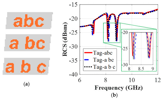 We now analyze the effect of the spacing between the letters in the realized tag-abc by investigating different simulated tag-models in Figure 16a. All nine resonant frequencies representing the tag-ID of ‘abc’, ‘a bc’ and ‘a b c’ can be observed in the simulated co-polar RCS results in Figure 16b. It shows that a slight variation in the spacing between the letters does not create problems with the identification of the tag, printed with or without the extra spaces in-between the letters. This is because the difference between the shapes of the resonance troughs is almost negligible for different cases shown in Figure 16a, owning to the installation of the ground plane under the printed tag-IDs. Consequently, we can use this technique of separation between the letters to increase the number of coding combinations introduced by this type of tag.