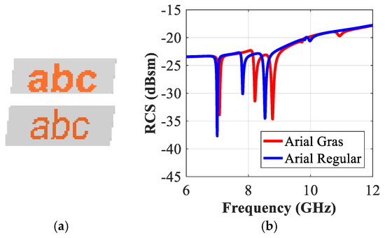 RCS Simulation results of tag-abc printed by Arial font with different styles: (a) Tag-abc written by Arial gars and regular style; (b) Co-polar HH RCS responses.