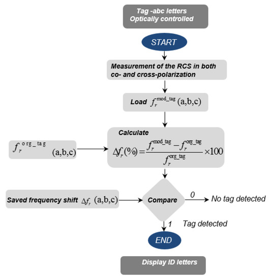 The algorithmic flow chart of the proposed method for the robust detection of the alphabet tags is depicted in Figure 20, which shows the steps of the developed algorithm for the robust and accurate detection of the tag-IDs based on the frequency shift analysis of their recorded co- and cross-polar RCS responses. The calculated percentage change () in resonance frequency of the particular tag-ID configuration is compared with the pre-stored resonance frequency shift information about that specific tag-ID configuration. Lastly, the tag-ID is decoded based on the matching between the saved frequency shift value and the calculated frequency shift value. Besides the decision based on Figure 20 algorithm, the tag-IDs can also be optically detected which increases the robustness of the proposed method.