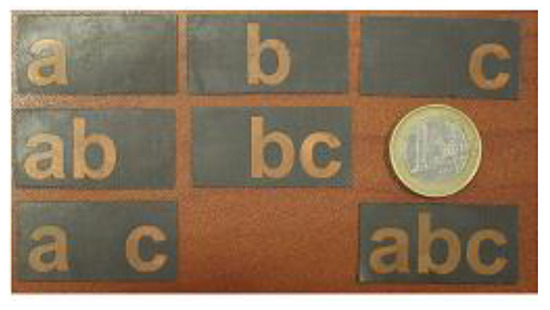 To validate the new chipless tag designs, we have investigated the letter-tags corresponding to seven different combinations of alphabets ‘a’, ‘b’, and ‘c’ shown in Figure 19. The alphabet shapes were printed by using copper etching on a Taconic TLX-8 substrate, having a thickness of 0.5 mm. Each realized letter-tag of Figure 21 has a standard Arial font with a size of 15 mm, in order to operate in the ultra-wide-band frequency spectrum of 6 to 13 GHz with a multi-directional radiation pattern.