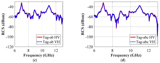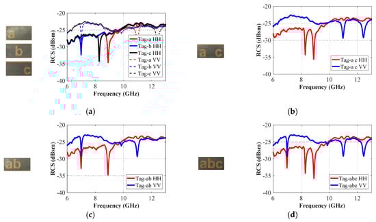Measurement co-polar (HH/VV) RCS results: (a) Tag-a, -b, and -c; (b) Tag-a c; (c) Tag-ab; (d) Tag-abc.