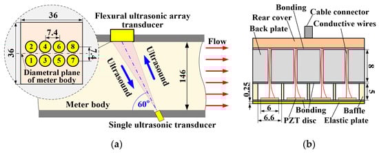 Schematic diagrams of the flow meter system, showing (a) the position of the ultrasonic transducers inside the meter body, and (b) the construction of the flexural ultrasonic array transducer. All dimensions are in millimeters.