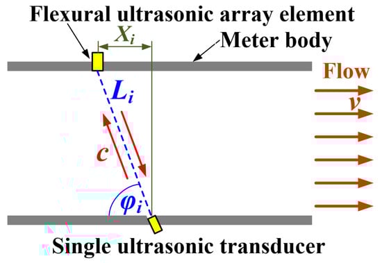 For reference, the transit-time ultrasonic flow measurement method is schematically illustrated in Figure 2 in the context of this research, where only one array element and its corresponding ultrasonic path are shown for simplicity. In Figure 2, represents the speed of ultrasound in the fluid, denotes the average flow velocity of the fluid over the cross-sectional area of the meter body, stands for the axial distance between the centres of the i-th array element and the single transducer, denotes the angle of the ultrasonic propagation path to the wall of the meter body, and represents the true distance between the centre of the single transducer and the i-th array element. A simultaneous equation can be formed by Equation (1) to describe the relationship between the propagation distance of ultrasound , the speed of ultrasound , average flow velocity along the ultrasonic path , and the time of flight () of ultrasound travelling downstream and upstream [,,,].