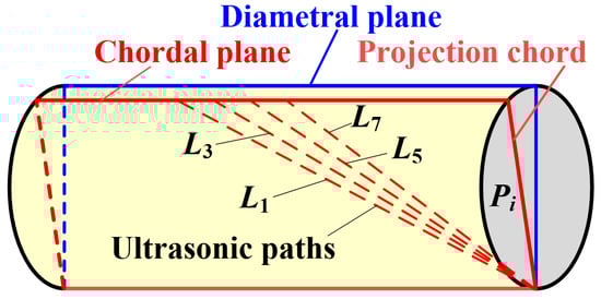 In a fully developed and undisturbed flow profile without swirl or pulsation, the flow velocity profile at any cross-section of a pipe is constant, and therefore, the complete average flow velocity determined from the velocities of the individual ultrasonic paths is equivalent to the average flow velocity along their corresponding projection chords on the cross-sectional area of the pipe, as illustrated in Figure 3. Only the four ultrasonic paths defined by the array elements (1,3,5,7) are shown in Figure 3 for clarity. Therefore, Equation (3) can also be expressed as Equation (6), where is the projection chord of the ultrasonic path on the cross-sectional area of the pipe.