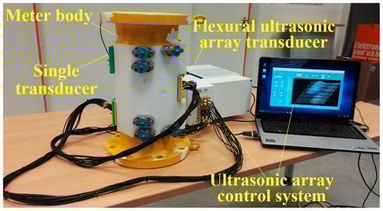A 32-channel ultrasonic array control system (FIToolbox, Diagnostic Sonar, Livingston, UK) controls the generation and detection of the ultrasonic transducers, enabling the acquisition of ultrasonic signals at different flow rates. The control system, which comprises the single transducer and flexural ultrasonic array transducer, is shown alongside the meter body in Figure 4 [].