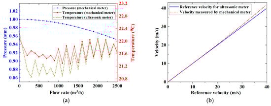 (a) Variations of pressure and temperature in the calibrated reference mechanical meter and the ultrasonic flow meter for different flow rates, where the ultrasonic meter pressure is a constant 1 atm; and (b) the comparison between flow velocity measured by the reference mechanical meter and the deduced reference flow velocity for the ultrasonic flow meter.