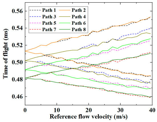 The ultrasonic speed was estimated according to Equation (8) for the zero-flow condition; and thus, the for each ultrasonic path could be calculated based on the length of its respective corresponding path. The differences in between non-zero and zero flow conditions for each ultrasonic path were respectively calculated by the FIToolbox system based on cross-correlation. Therefore, the of each path at different flow rates could be determined [], and these are shown in Figure 6.